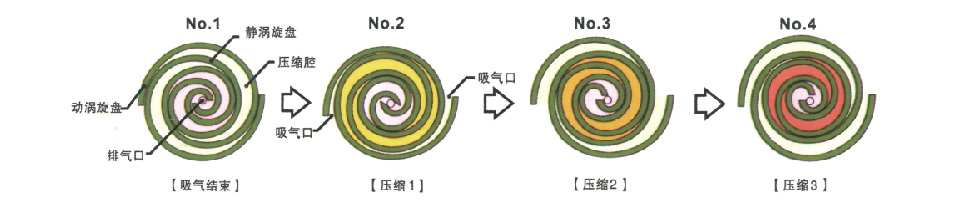 動渦旋盤按照下圖NO.1 → NO.2 → NO.3 → NO.4的順序旋轉(zhuǎn),因此與點對稱的位置處的月牙形壓縮腔容量會逐步減小,氣體壓縮后從中心部的排氣口排出。