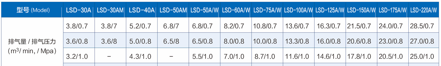LSD系列(直聯(lián))螺桿式空氣壓縮機(jī)技術(shù)參數(shù)(22kW-160kW)